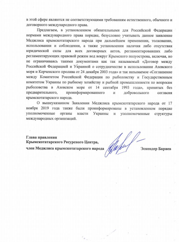 У листі представники Меджлісу виказали невдоволення визначенням статусу Криму та прилеглих до нього морських просторів Чорного та Азовського морів, включаючи Керченську протоку та Сиваш відбувається без участі кримськотатарського народу.