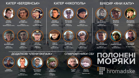 25 листопада торік у Чорному морі російські прикордонники захопили 3 українських військових судна та 24 членів екіпажу. Моряків доправили до російського слідчого ізолятору "Лефортово", де тримають і сьогодні, а кораблі - 2 малих броньованих артилерійські катери "Бердянськ" і "Нікополь", а також буксир Яні Капу пришвартували в окупованій Керчі.
