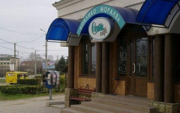 Рекламний щит біля кафе інформує, що військовим російського флоту надають знижку в розмірі 10%. Для цього достатньо прийти до закладу у формі або надати військовий квиток.
