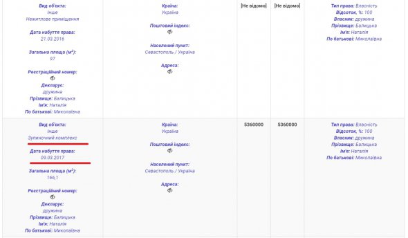 Відповідно до декларації Балицького, його дружина Наталія Балицька 9 березня 2017-го придбала 100% права власності на зупинковий комплекс у Севастополі загальною площею 166 кв. м на суму понад 5 млн грн.