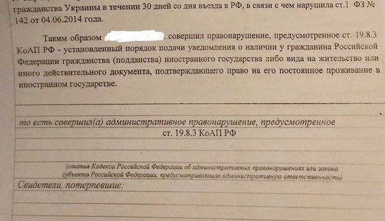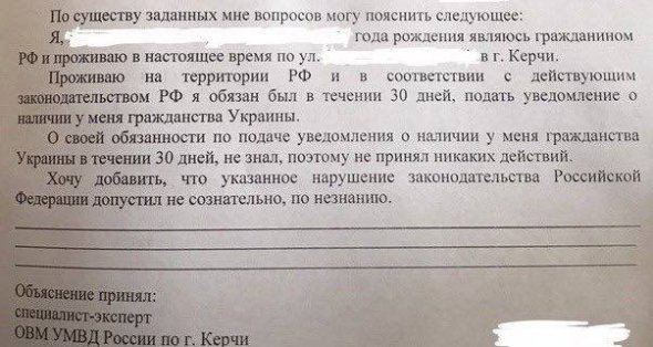 "Чоловік обурений, через те, що ті ж самі співробітники ФМС у 2014 році говорили про те, що кримчани не зобов'язані подавати відомості про наявність у них громадянства України, бо саме по собі набуття в 2014 році кримчанами громадянства Росії мало на увазі наявність українського громадянства", - йдеться в повідомленні кримських ЗМІ.