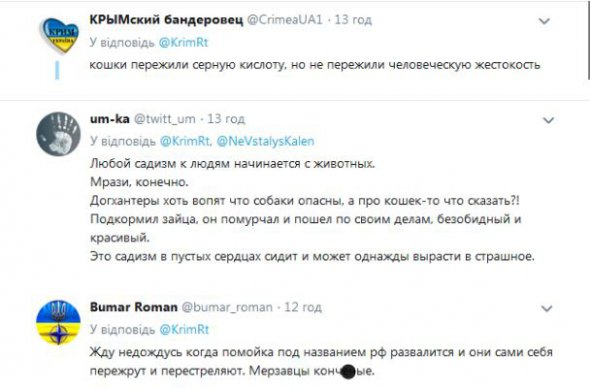 "Світовий заповідник фашизму", "Які покидьки", "Бідні котики. Ось і до вас добрався русскій мір", "Бидло бл*, а не люди", "Кицьки пережили сірчану кислоту, але не пережили людську жорстокість", "Чекаю-недочекаюсь, коли смітник під назвою РФ розвалиться і вони самі себе пережеруть і перестріляють" , - написали люди в коментарях.