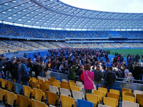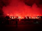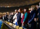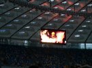 Вивіску підсвітили фаєрами. На 2 великих екранах із різних боків стадіону можна було побачити фотографії українських політв'язнів у Росії.