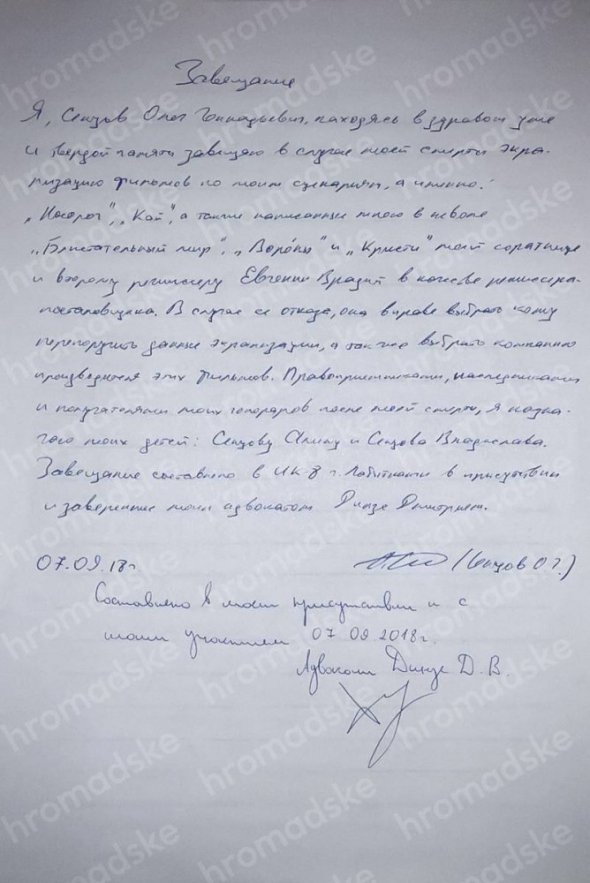 Правонаступниками, спадкоємцями та одержувачами моїх гонорарів після моєї смерті я призначаю моїх дітей: Сенцову Аліну та Сенцова Владислава. Заповіт складено в ІК-8 міста Лабитнангі у присутності та завіреності моїм адвокатом Дінзе Дмитром. 7 вересня 2018".