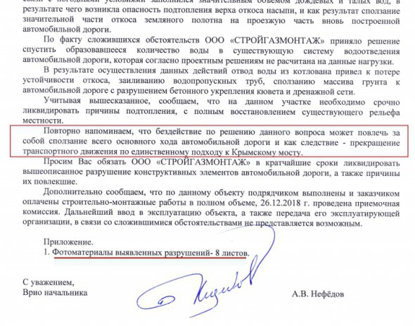 "Повторно нагадуємо, що бездіяльність щодо розв'язання даного питання може спричинити сповзання всього основного ходу автомобільної дороги і як наслідок - припинення транспортного руху по єдиному підходу до Кримського мосту", - йдеться в документі.