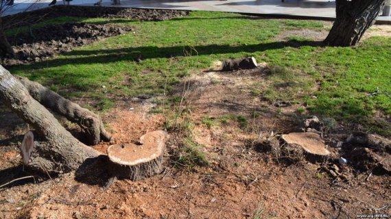 Так звана влада Криму обіцяє людям на місці старих дерев висадити нові садженці та квіти, але досі не виділили на це гроші.