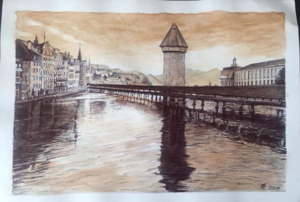 "У новому листі від батька лежав його сімнадцятий малюнок - пейзаж швейцарського міста Люцерн. Він виконаний на папері формату А4 за допомогою кулькової ручки, чаю, олівця та лушпиння цибулі", - розповіла донька.
