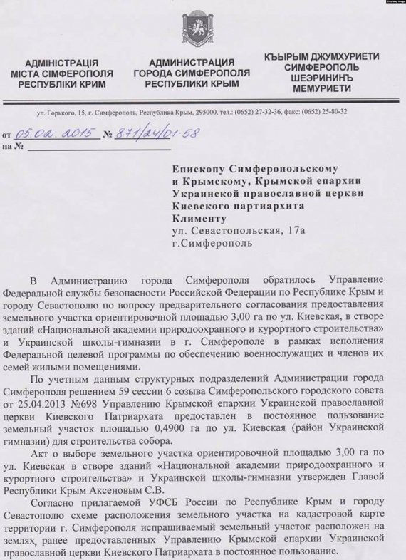 У листі владику змушували на добровільній основі відмовитися від ділянок та передати ці землі так званому УФСБ в Криму.