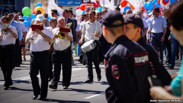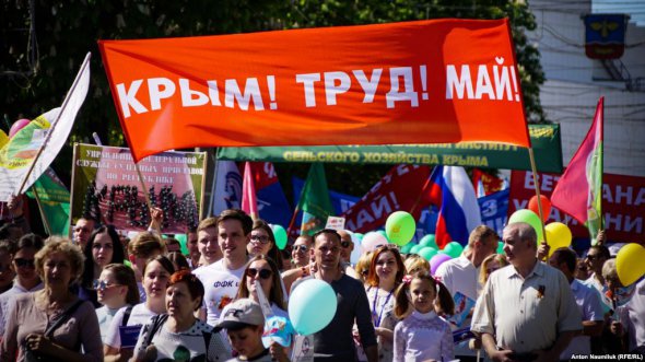 Люди йшли з прапорами Росії й анексованого Криму. Постійно вигукували першотравневі гасла радянського періоду.
