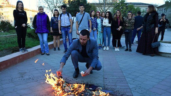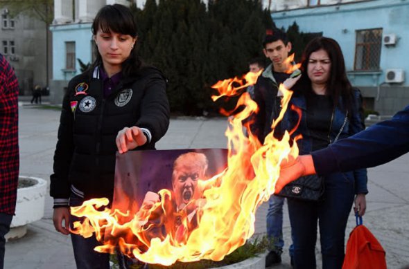 В анексованому Росією Криму провели акцію проти ударів західної коаліції по Сирії, під час якої спалили портрети лідерів США, Франції і Великобританії.