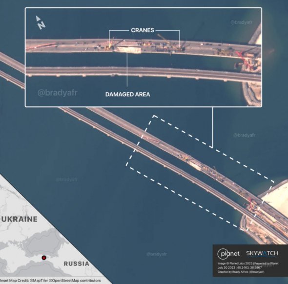 "Поточний ремонт Кримського мосту можна побачити на нових супутникових знімках Керченської протоки", – йдеться у повідомленні.