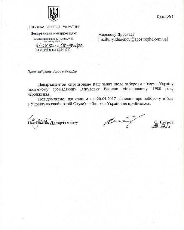 "Станом на 20 квітня 2017 року рішення про заборону на в'їзд в Україну вказаної вами персони Служба безпеки не приймала", - йдеться у відповіді на запит "Апострофа" про заборону цього артисту в'їжджати в Україну.
