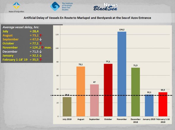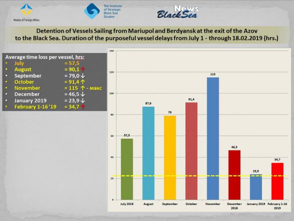 "У порівнянні з січнем - на вході до Азовського моря - в середньому з 32,1 до 35,5 годин (+10,6%), а на виході з Азовського моря - в середньому - з 23,9 до 34,7 годин (+ 45,2%)", - повідомив головний редактор "BlackSeaNews" Андрій Клименко у Facebook.