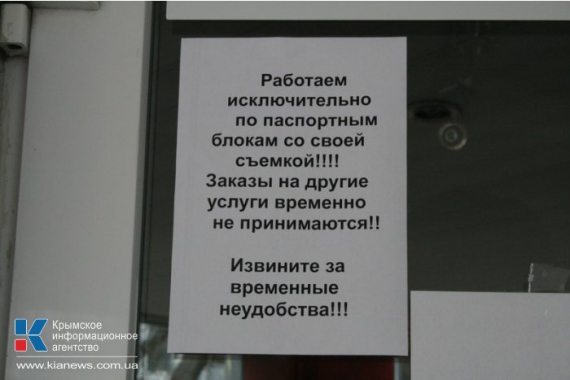 Щоб зробити фото для російського паспорта, сімферопольці по три години стоять у довжелезних чергах. Користуючись масовим напливом людей, вартість фотографій у фотоательє зросла майже на 50 відсотків. Раніше фото на документи коштувало 20-25 гривень. Тепер від 30 до 40.