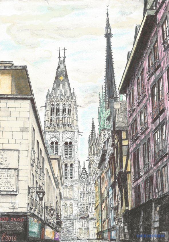 На малюнку Руанський собор. Журналіст намалював його за допомогою кіровського рожевого кисиля, бо перший малюнок десь зник.