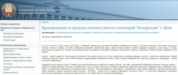 На сайті управління справами президента Республіки Білорусь в розділі "Охорона здоров'я, туризм і відпочинок" розповіли, як можна незаконно потрапляти у санаторій "Білорусія" в окупованому Криму.