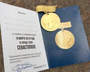 "На пам'ять про референдум 16 березня 2014 року у місті-герої Севастополі", - йдеться на вкладці до медалі. Там же стоїть підпис голови незаконної Севастопольської міської комисії з проведення референдуму.