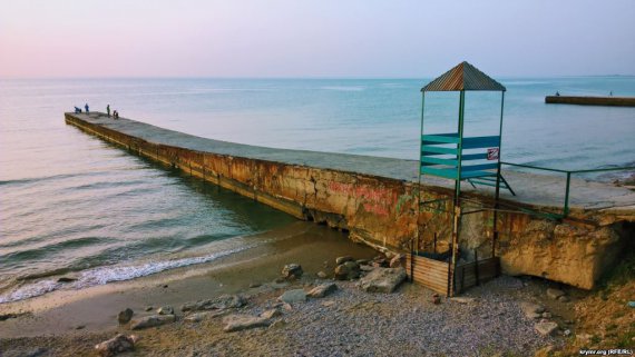 На фото - приморське селище Піщане. Воно розташоване неподалік Сімферополя та Бахчисарая та вважається недорогим сімейним курортом. Жителі сусідніх міст приїжджають сюди через близьке розташування курорту. Уздовж моря розташовані до 20 оздоровчих комплексів. Зараз пляжі і комплекси пустують – відпочивальників можна порахувати на пальцях. Багато закладів на пляжі закриті.