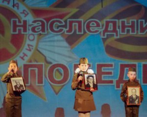 Щоб показати патріотизм, вчителі одягли дітей у військову форму і дали зброю часів війни. На сцену діти виносили портрети родичів-ветеранів.