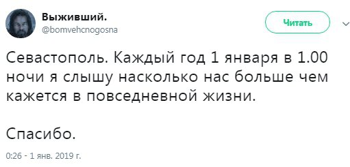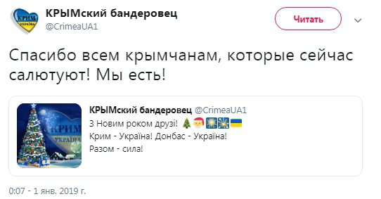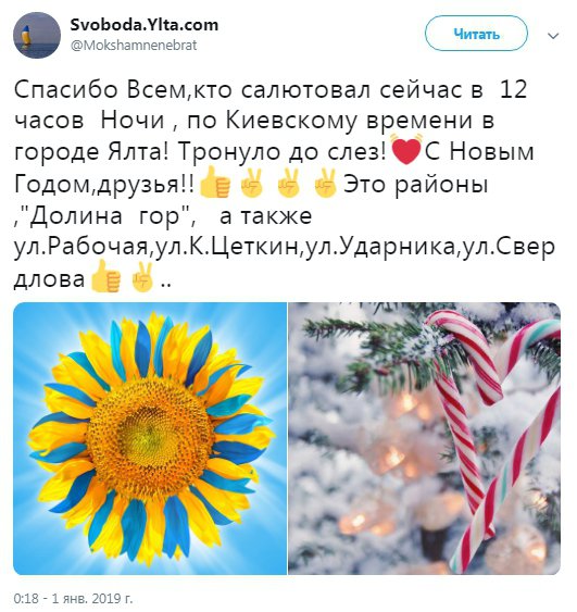 "Спасибі всім кримчанам, які зараз салютують! Ми є!", "О першій годині ночі в Криму звучать салюти. З Новим роком, моя улюблена Україна!", "Севастополь. Щороку 1 січня о першій ночі я чую наскільки нас більше ніж здається в повсякденному житті. Спасибі"," Чим ближче деоккупація, тим голосніше феєрверки в Новий рік по Києву!", - пишуть користувачі.