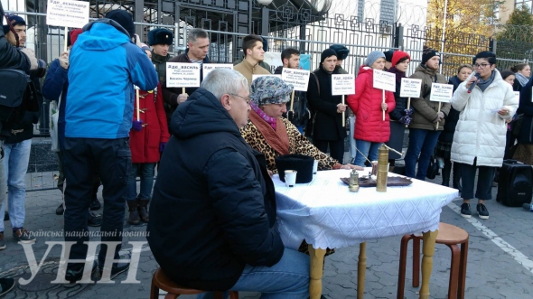 Активісти влаштували перформанс - поставили перед посольством стіл, за який посадили чоловіка та жінку. За словами ініціаторів акції, це - батьки, які чекають на свого зниклого сина.