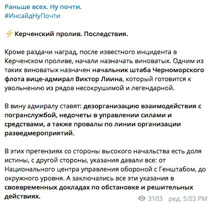 Одним з перших звільнених став віце-адмірал Чорноморського флоту РФ Віктор Лііна, пише російський інформаційний ресурс "Раніше всіх. Ну майже"