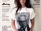 На фото дівчина знята до талії. Емілі одягла сірий мереживний фактично прозорий топ на тонких бретельках. Вуха модель прикрасила масивною срібного кольору біжутерією.