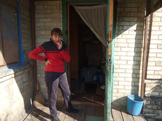 "Навколо багато зруйнованих і покинутих будинків, на подвір'ї завелись щурі та миші. Лідія Петрівна розповідає, що "прилітало" у її двір неодноразово, навіть уламки пошкодили дах. Але його вже трохи підлатали за допомогою дошок і брезенту. Фанеру на вікна надала військово-цивільна адміністрація", - пояснює жінка.