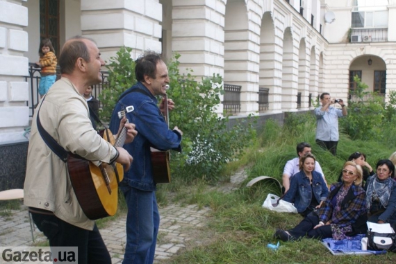Два барди співають щось іронічне про Львів, який став столицею світу і про Україну, яка "насправді на всій землі". Слухачі, серед яких політик Олександра Кужель, сміються й енергійно аплодують.