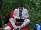 29-річний Дмитро Потєхін сидить із ноутбуком на колінах серед трави на чомусь схожому на крісло без ніжок.
