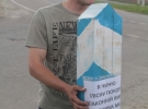 Ще двоє активістів дістають з однієї з машин дерев'яний стовп, щойно пофарбований біло-блакитними смужками.