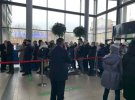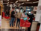 Фудкорти на останньому поверсі також переповнені людьми. Ходять з підносами від стійки замовлення до столиків.