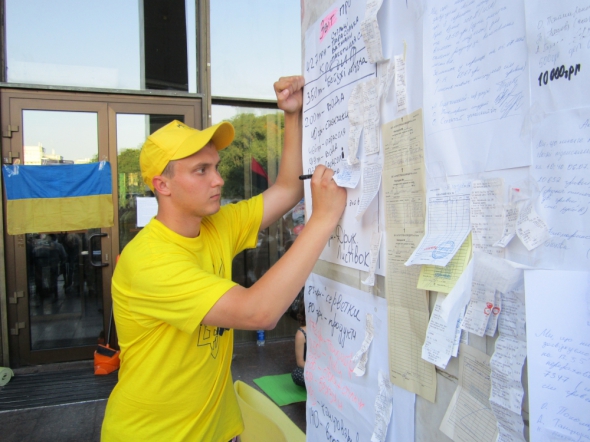 "Вчора перерахували гроші, які пожертвували люди на потреби учасників мітингу. У касі було 20 тисяч 652 гривні, 300 доларів і 100 рублів. Склали про це акт і вивісили на загал громадськості. За дві доби люди накидали у скриньки для пожертв десь 30 тисяч гривень. Хтось кидає 2-5 гривень, хтось по 100-200. Жертвують і долари, і рублі. Вчора один чоловік приніс пачку, 10 тисяч гривень. Представлятися спочатку не схотів. Потім сказав, що Ярослав зі Львова. Мабуть якийсь бізнесмен".