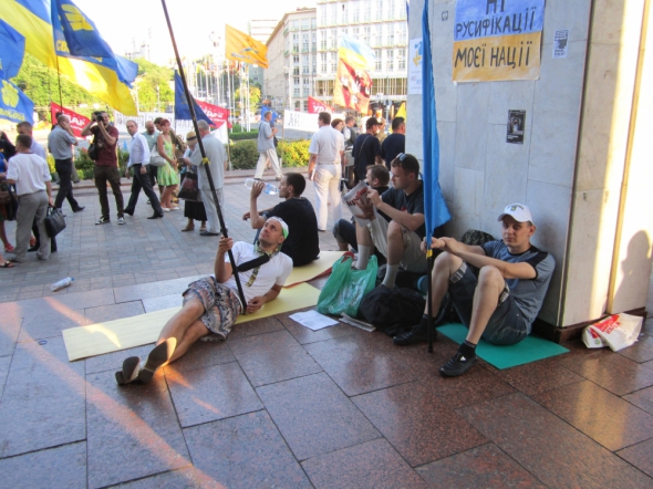 "За зібрані гроші купуємо тільки воду. Бо дуже спекотно. Люди постійно хочуть і просять пити. Ми харчуємось за свій рахунок. У день в мене йде по 100 гривень — на їжу, воду, морозиво. Багато киян підтримує нас. Вранці чоловік приніс пакет бутербродів. Їмо з чаєм. Я взяв тільки одного. Голодних було багато. В обід одна киянка принесла 3-літровий термос кави. Його випили за 4 хвилини. У ресторанах поблизу кава дорога, а до кавових автоматів далеко бігти. Дві жіночки з Броварів привезли домашнього хліба, банку сала і малосольних огірків. Це був найсмачніший обід у житті".