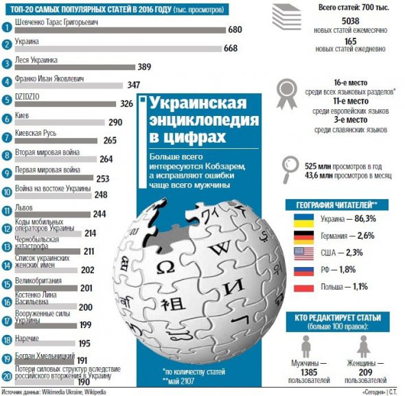 "Вікі" українською на 16-му місці серед 295 мов з усіх куточків планети. Розташувалась між версіями китайською і перською мовами. У верхній частині списку англійська версія (5,4 млн статей), себуанська (мова, поширена на Філіппінах – 4,5 млн статей) і шведська (3,7 млн статей).