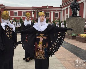 Також біля братської могили під час виконання пісні ходили дівчата в дивних костюмах та головних уборах.