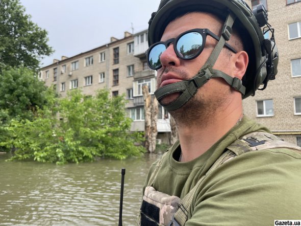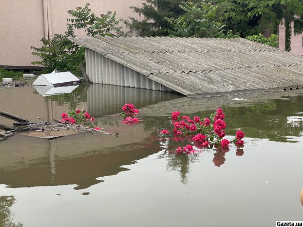 Повз повільно пропливають пластикові пляшки, деревʼяні балки, віття рослин і відірвані шматки будинків. Подекуди видно кузови машин і дахи будинків, біля них квітнуть високі кущі рожевих троянд, але вже до вечора усе це може також піти під воду. На вул. Михайлівській, ближче до річки зустрічаємо рятувальника Олексія – чоловік розшукує тварин. У повітрі роздається гучний вибух.