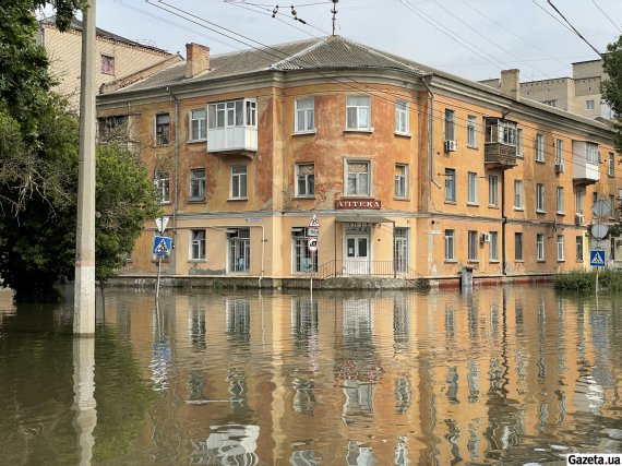 Вода підступила на кілька кварталів від річпорту, неподалік центру Херсона, і зупинилася перехресті Богородицької й Воронцовської вулиць. Звідси добре видно затоплену частину міста. Цегляна аптека №7, облицьовані фасади старих багатоквартирних будинків, магазин меблів і кавʼярні – занурились на кілька метрів у воду.