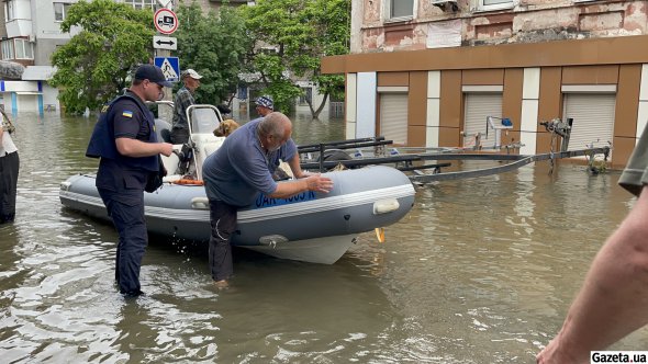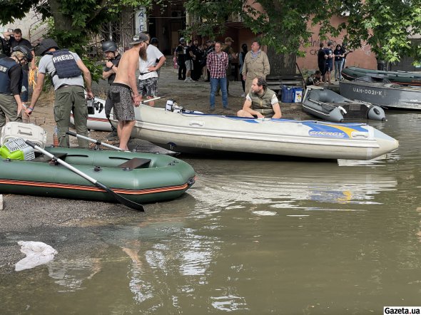 Рятувальники завантажують шлюпки. З собою беруть зброю, бо вирушають у небезпечну зону. Поруч зривається собачий гавкіт, люди просять води й шукають своїх улюбленців. Волонтери окремо також проводять операції з пошуку тварин – їх на затопленій частині міста ще багато.