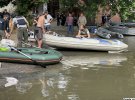 До берега підпливає білий моторний човен. Керманич у бронежилеті й касці кольору хакі зупиняється за кілька метрів від розпеченого асфальту. Стає на ноги і, вчепившись обома руками за стовп електропередач, підтягує до нього катер. Підплисти ближче не зміг, бо заважає масивний мотор позаду.