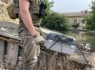 На корму заскакує смуглявий військовий, знімає піксельну футболку й одягає червоний рятувальний жилет. У човні підлога мокра й вкрита водоростями. На борту все завалено сітками, переносками для котів. Є ковдри й печиво.