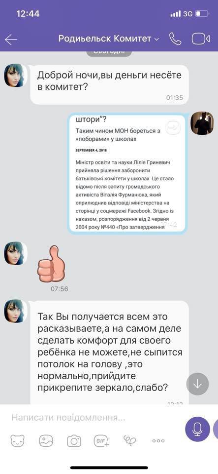 Батько одного з учнів Володимир Шевченко виклав у мережу переписку з головою комітету на сторінці "Батьки SOS". Та писала йому серед ночі, нагадуючи про внесок.