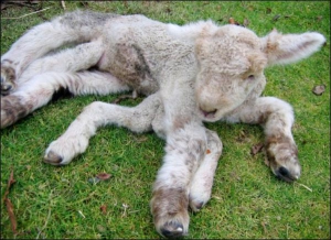 У ягняти дві додаткові передні ноги, абсолютно зайві, і три задні. Воно ходить за допомогою здорових передніх і трьох задніх ніг. Крім того, це ягня - гермафродит і у нього відсутня частина кишечника.