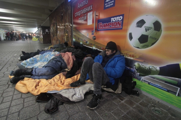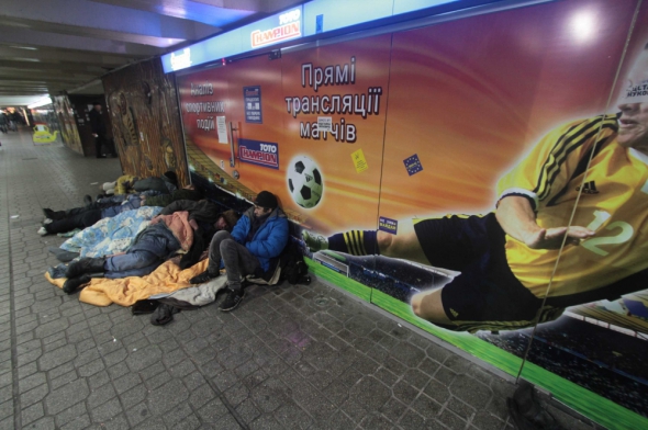 Зараз безпритульні збираються в підземному переході біля метро Майдан Незалежності. Під стінами вони розкладають свої речі: ковдри, пледи і теплі куртки. 17 грудня близько 15.00 тут спали 5 безпритульних.