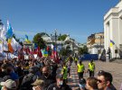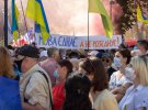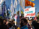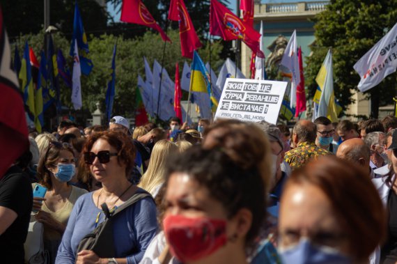 Під прапорами України, партій Європейська Солідарність, Демократична Сокира, Свобода, Національний корпус та інших люди виступають проти скандального законопроекту нардепа від "Слуги народу" Максима Бужанського. Депутат пропонує скасувати в законі про мову вимоги про перехід учнів 5-11 класів російськомовних шкіл на українську мову навчання з 1 вересня 2020 року.