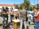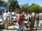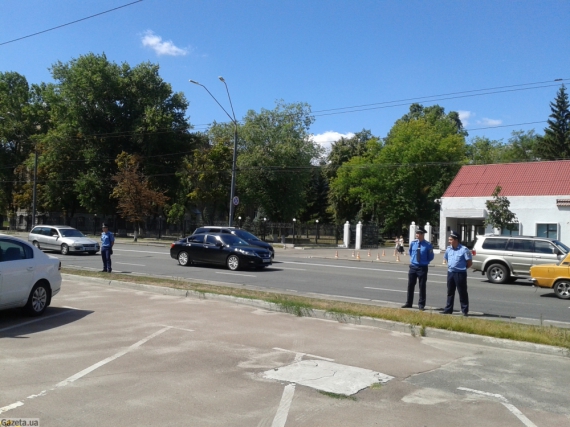 Активісти зупиняються трохи поодаль від головного входу і встановлюють дерев'яний стіл, який принесли із собою. Вздовж залізного паркану чатують пару десятків правоохоронців, неподалік від них — група ще з десятьох міліціонерів. Вздовж дороги також вичатувалися співробітники міліції — стоять через кожні пару метрів один від одного.