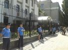 За кілька хвилин активісти згортають прапори та плакати та йдуть від посольства. Обіцяють, що акція була не останньою.