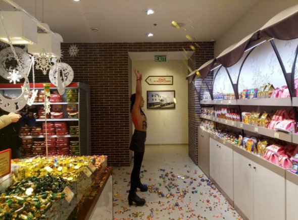"Чорна п'ятниця" особисто прийшла до центрального магазину корпорації Рошен у центрі Києва. Користуючись знижками, набивала сумки смачною і дешевою продукцією всесвітньо відомої кондитерської фабрики", – прокоментували у Femen акцію.