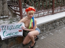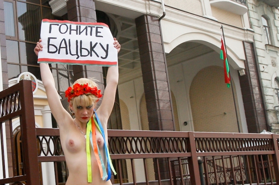Активістки жіночого руху FEMEN влаштували чергову епатажну акцію. Дівчата прийшли до будівлі посольства Білорусі в Києві, аби загітувати білорусів на виборах прогнати Лукашенка і поставити на чолі держави жінку.