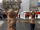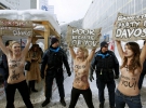 Свої претензії до світових лідерів дівчата розмістили на своїх тілах, перетворивши їх в живі плакати: "Криза. Зроблено в Давосі", "Давос - бандитська вечірка", "Жебраки з вашої вини!".